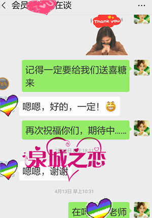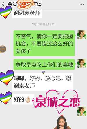 现在的我们进展很顺利,父母也都很满意,预计的婚期在今年的下半年。再次感谢姐姐们的付出,你们的功德一定会给你们带来福报 ,希望更多的单身男女朋友们来到泉城之恋遇到你们解决终身大事,也祝愿泉城之恋平台越做越大越做越好。