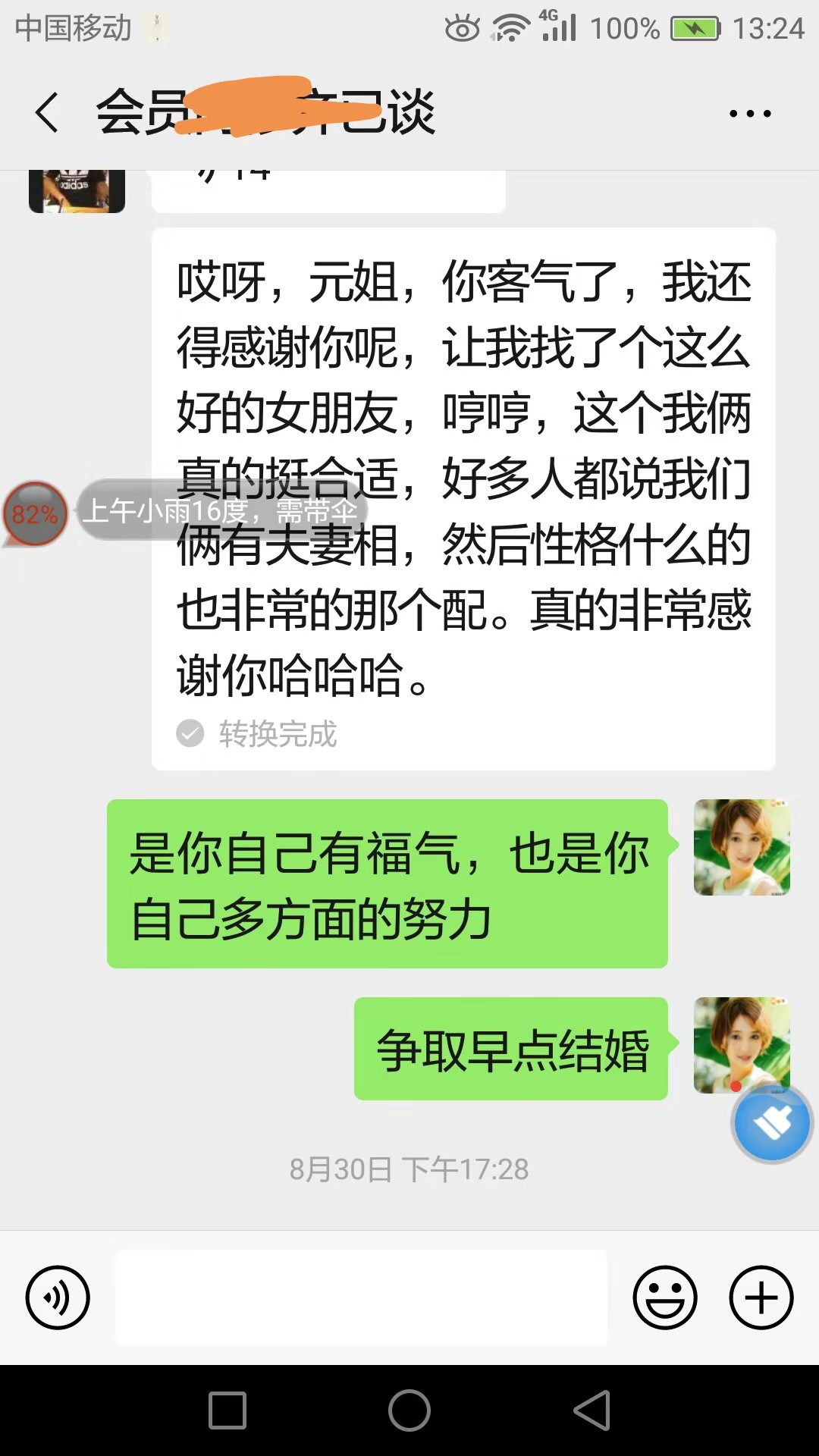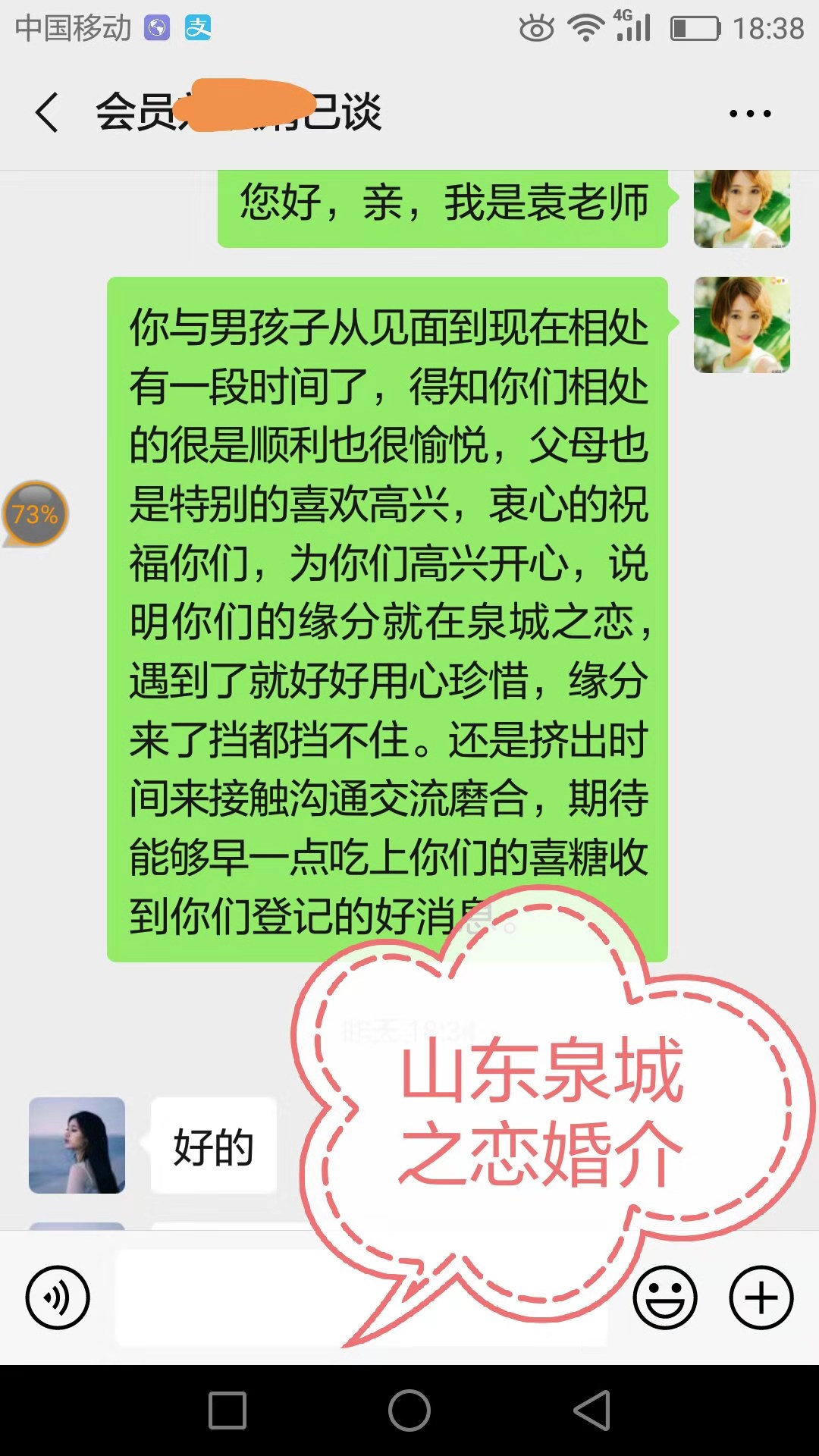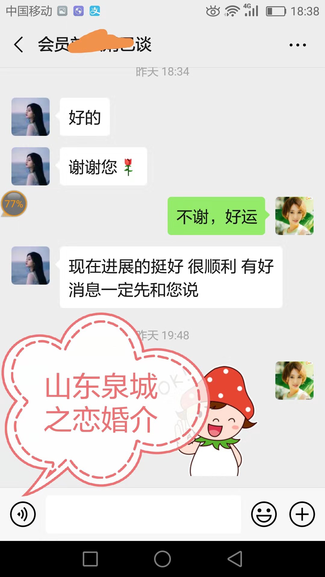 不巧的是,袁姐那天喝喜酒回来的有点晚,是王菲老师与另一个王丽老师接待的我们,经过详细的了解与沟通,我与妈妈商量了一下办理了会员,半年的时间应该是可以给自己一个机会的。于是办理完手续后一周的时间袁姐给我安排了相亲,说心里话见了两个女孩都不错,但人家好像并不是特别的着急找对象,你联系她,她就回复一下,你不联系对方也不说话,我心里没底加之工作比较忙,于是有点想放弃的感觉,7月9号,袁姐给我又推荐了一个女孩,这是我见过的第三女孩,第一眼就有所心动,聊天后感觉特别的舒服,女孩性格很好,是一个爱笑的女孩,我们聊天没有那种拘束感,有一种似曾相识久违的感觉。