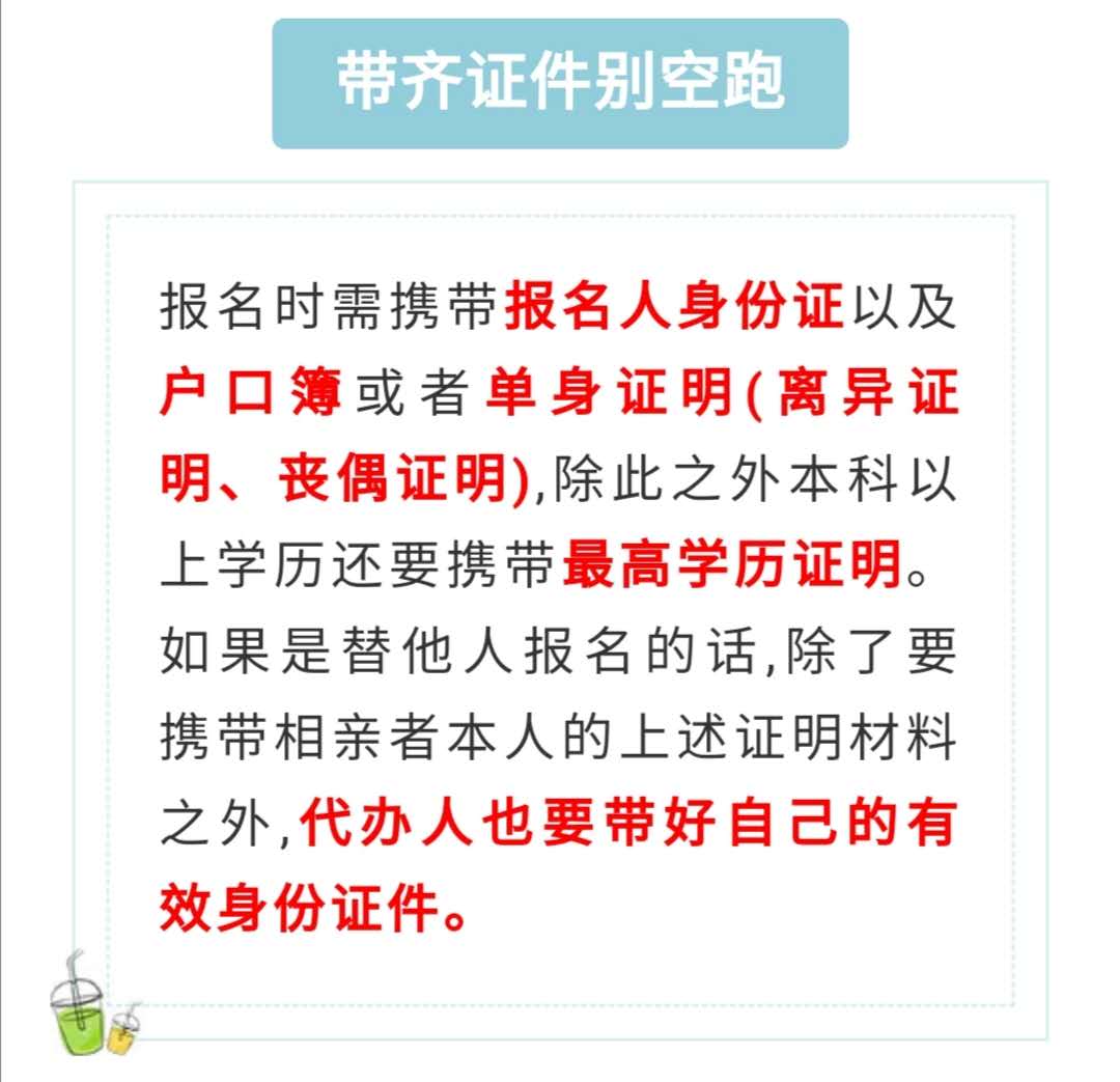 最后提醒您不要忘了带以下证件哦:1身份证,2户口本,3单身证明(离异证,丧偶证)4一张报名者或家人的近期一寸免冠照片和办证人身份证,用于办理相亲会期间出入证(仅限一人)。