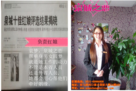 爱情是一种缘份,但缘份不是天上掉下的。缘份是勇于追求勇于寻找并持之以恒的结果。爱情是感情的碰撞,更是一种执着的选择,成功的爱情,需要冷静而理智的判断,广泛而充分的选择。选择什么样的爱情,就是选择什么样的人生。你还在茫茫的人海中苦苦寻觅另一半吗?你认为寻找志同道合的爱人很艰难吗?你渴望找到属于自己心灵的港湾吗?那么请来“泉城之恋”找我们的袁梦老师吧,相信她不会让你失望的!