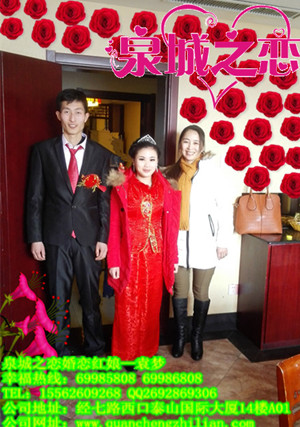 2015年2月12号我们结婚了,感谢泉城之恋的袁姐让我认识了现在真正属于我的新娘,我们都是来自于农村,我是针对工程的,我女朋友是事业单位护士,我们彼此的工作环境与学历都不是被人们所看好的门当户对,通过袁老师中间撮合后我们开始了顺利交往处对象,后来 家里人知道了我们的关系后得知我女朋友家没有什么亲人后很是担心,但只要是两个人心在一起,她能包容我的缺点与任性。只要是彼此相爱,我想没有什么解决不了的问题。当然中间也少不了袁姐的说和工作,我想我们走到一起很不容易,老天爷也会帮我们的,真的是用心付出用心做事,家人理解了我们的相处,也接纳了我们的感情,所以我们幸福的走到了一起,感谢袁姐,感谢泉城之恋,更要感谢我的家人,最主要的是感谢我的女朋友,她对我的不离不弃,理解与包容吧。走入婚介征婚相亲不丢人,也并不是来婚介找对象的都是条件差有毛病的,更不是如外界所传言的婚介不靠谱,别的我不清楚,但我感觉我找到了幸福生活,我信了,来泉城之恋是对的,希望你如果是单身的话不要轻信外界传言用心感受一下,给自己机会也在给对方机会,你说呢?