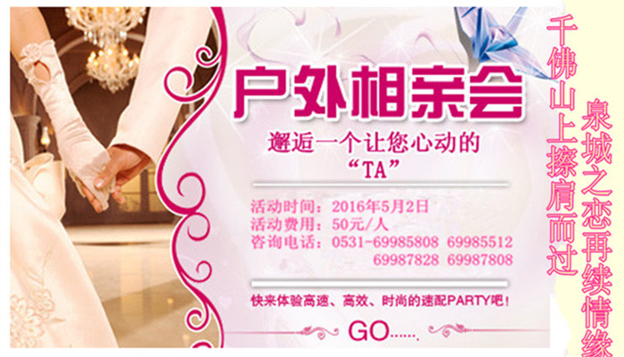 活动费用:凡在泉城之恋报名参加千佛山相亲会的单身人士可凭编号免费参与,其他社会单身人士50元/人