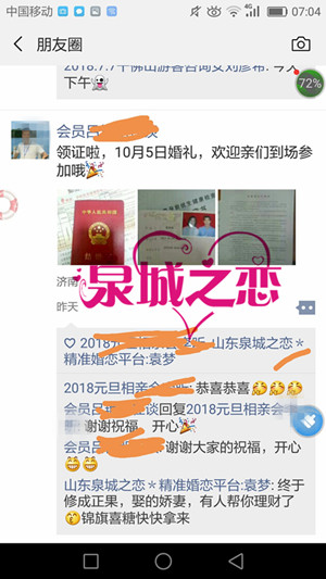 通过报名相亲会我认识了泉城之恋的几位姐姐,几次沟通之后,我也去过其他的婚介机构,但总不如这里舒服温馨感觉像是到家的一样。年龄不小了,也该稳定下来了,于是找到了袁老师与董老师办理会员之后,两位姐姐为我安排了女孩见面,我女朋友是我见过的第三个女孩,我知道我这么多年一直等的这个人就是她、我知道我想找什么,在各位姐姐的帮助下,我很顺利的与女孩相爱了。今年十一之后贮备登记结婚了。