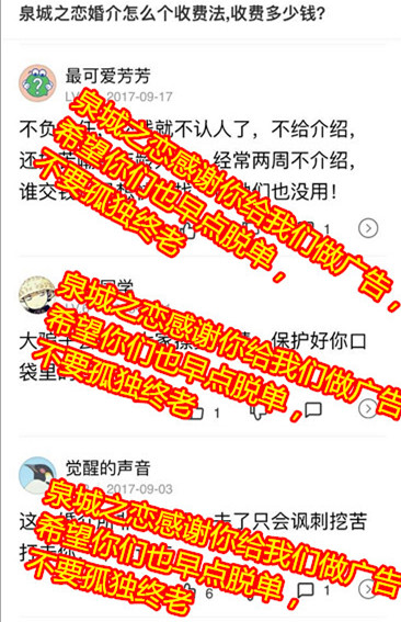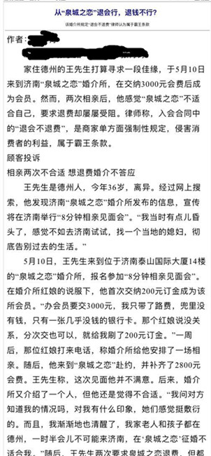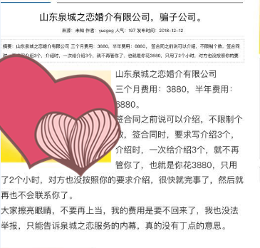 今天有一位客户给我们截图事关泉城之恋的报道,我们感谢这些媒体给到泉城之恋的关注,或许他们第一感觉就是消费者是弱势群体,在一个机构消费后,接受了不平等的待遇,第一时间就是为他们抱打不平,当然也有诸多的个人行为,略懂一点网络研发程序,就去网上对泉城之恋品牌打压攻击。说心里话,婚介是服务平台机构,提供信息资源,确保每个来相亲的人员,信息资料真实安全有效,(人品未做审核),我们的服务宗旨也是拒绝婚托婚骗,杜绝交友,不期骗,不隐瞒,不夸大其词,事实其实的为单身朋友们介绍对象。泉城之恋审核每个人的证件:身份证,学位证,户口本个人页,有婚史的离婚证,离婚协议书,名下有婚房的房产证或购房合同,教师资格证,医生资格证,生活照,收入上万的要审核收入证明等。(健康证暂不要求提供)。